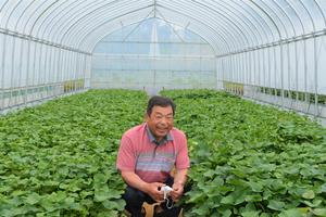 町内でサツマイモの苗を栽培している猪狩富夫さんの畑です。猪狩さんが栽培されているサツマイモの品種は紅まさり、紅はるか、シルクスイートなど。どの品種の苗も鮮やかな緑色で、元気に育っていました。