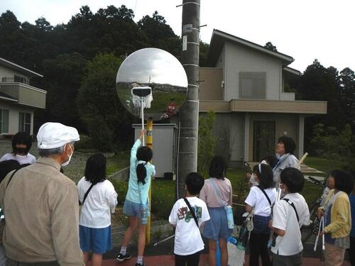 児童たちは清掃道具を手に取り、通学路を歩きながら一生懸命ミラーを磨き、ゴミばさみでゴミを拾いました。