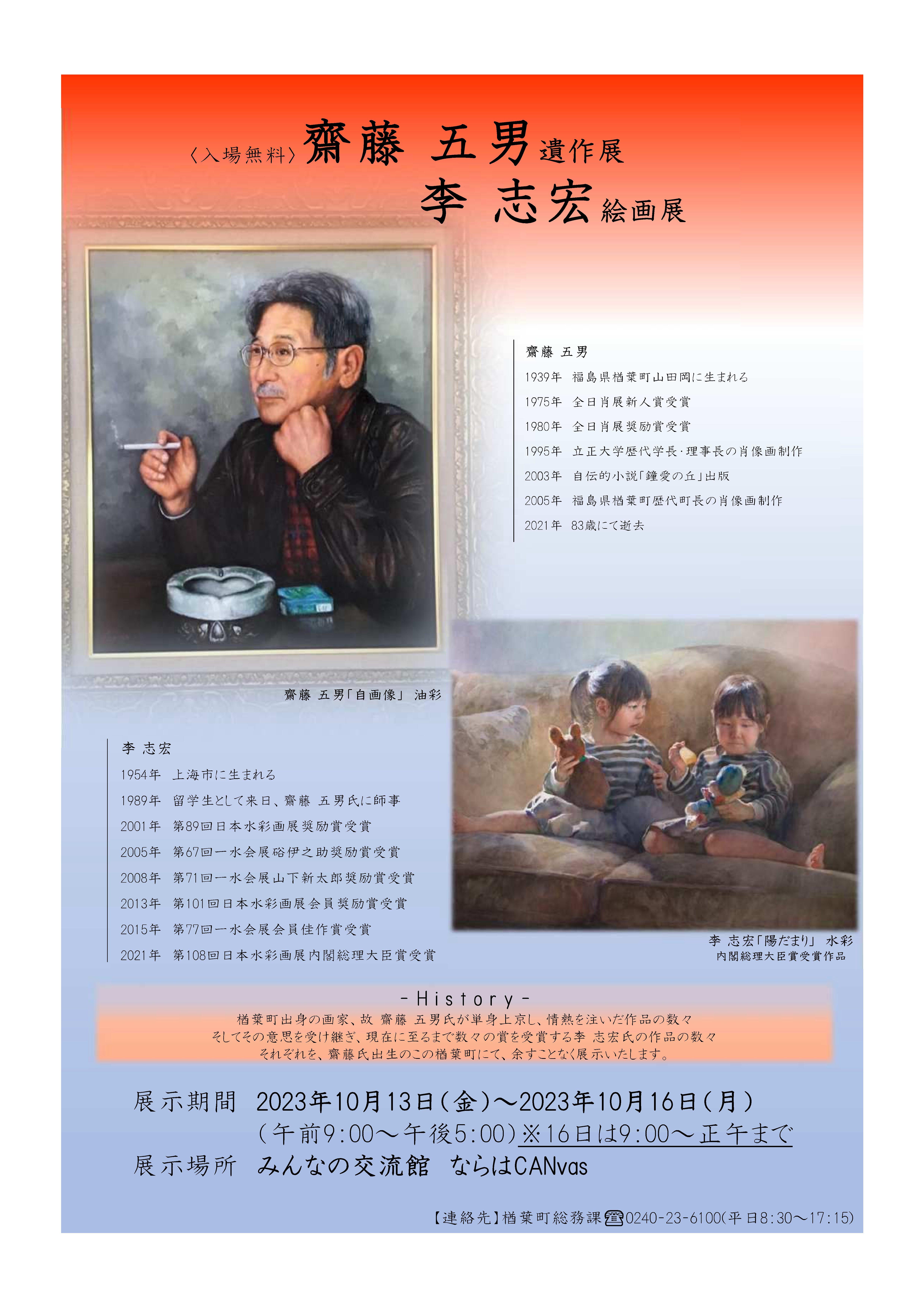 楢葉町出身の画家である故齋藤五男氏と、その意思を受け継ぎ現在に至るまで数々の賞を受賞する、李志宏氏の作品の数々を展示する「齋藤五男遺作展・李志宏絵画展」を開催します。